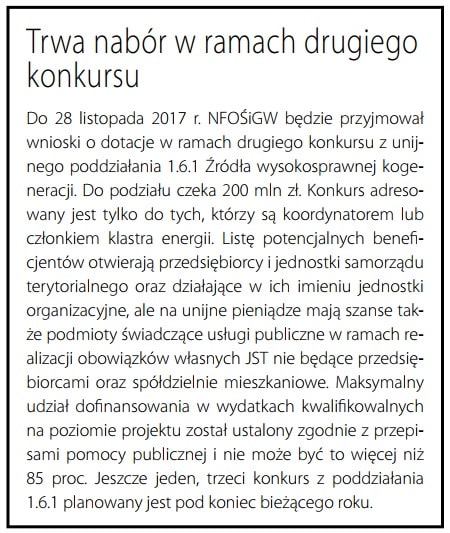 Wysokosprawna kogeneracja została doceniona przez Narodowy Fundusz Ochrony Środowiska i Gospodarki Wodnej. Zakład Energetyki Cieplnej z Dzierżoniowa, gmina Daszyna z województwa łódzkiego oraz Zakłady Produkcyjno-Usługowe „Prawda” z Olecka otrzymały największe jak dotąd dotacje w I naborze z unijnego poddziałania 1.6.1 Źródła wysokosprawnej kogeneracji.