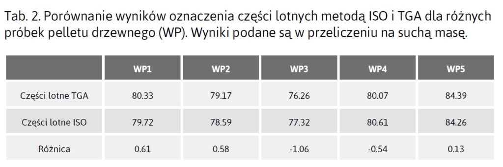 W przypadku części lotnych zarówno metoda ISO, jak i TGA określają ubytek masy podczas ustalonego czasu w temperaturze 900°C. Termograwimetr wymaga dodatkowego czasu nagrzewania przy przejściu z etapu oznaczania wilgoci (~105°C) do wyższej temperatury. Pomimo tej różnicy proceduralnej uzyskano bardzo dobrą zgodność wyników analiz dla obu w/w metod. Testy obejmujące szeroką gamę materiałów – od zrębków drzewnych, przez torf, węgiel, tworzywa sztuczne, aż po odpady – potwierdziły wiarygodność wyników otrzymanych za pomocą analizatora LECO TGA801. W przypadku pelletów drzewnych wyniki oznaczeń części lotnych wykazały silną korelację liniową między metodą ISO a TGA (R² = 0,94).