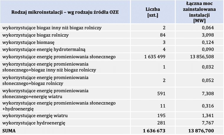 W oparciu o dane przekazane przez dystrybutorów energii Urząd Regulacji Energetyki przygotował raport dotyczący mikroinstalacji OZE. W zestawieniu wzięto pod uwagę najmniejsze instalacje odnawialnych źródeł energii, o łącznej mocy zainstalowanej do 50 kW, przyłączone do sieci elektroenergetycznej o napięciu znamionowym niższym niż 110 kV.