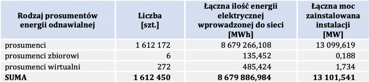 Ponad 98,5 proc. mikroinstalacji należała do prosumentów, których w całym kraju było 1 612 450. Instalacje prosumenckie odpowiadały za 94,4 proc. zainstalowanej mocy (13 101,54 MW) i niemal 97 proc. energii wprowadzonej do sieci ze wszystkich mikroinstalacji (8,680 TWh).