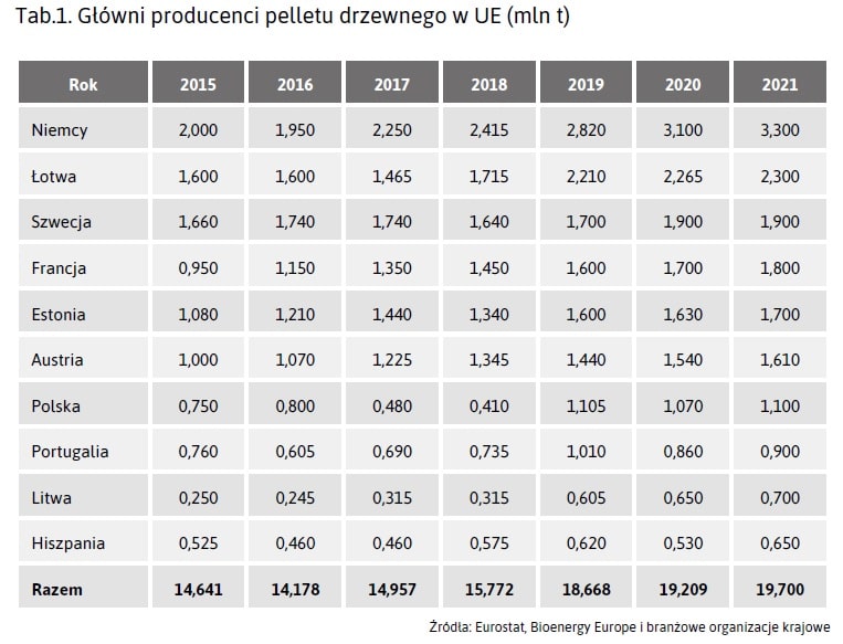 Z rachunków twórców Raportu wynika, że największym producentem pelletu drzewnego są Niemcy z produkcją szacowaną na 3,3 mln t w 2021 r., za nimi jest Łotwa z 2,3 mln ton i Szwecja z 1,9 mln ton. Według tego rankingu Polsce przypadło siódme miejsce z 1,1 mln ton.